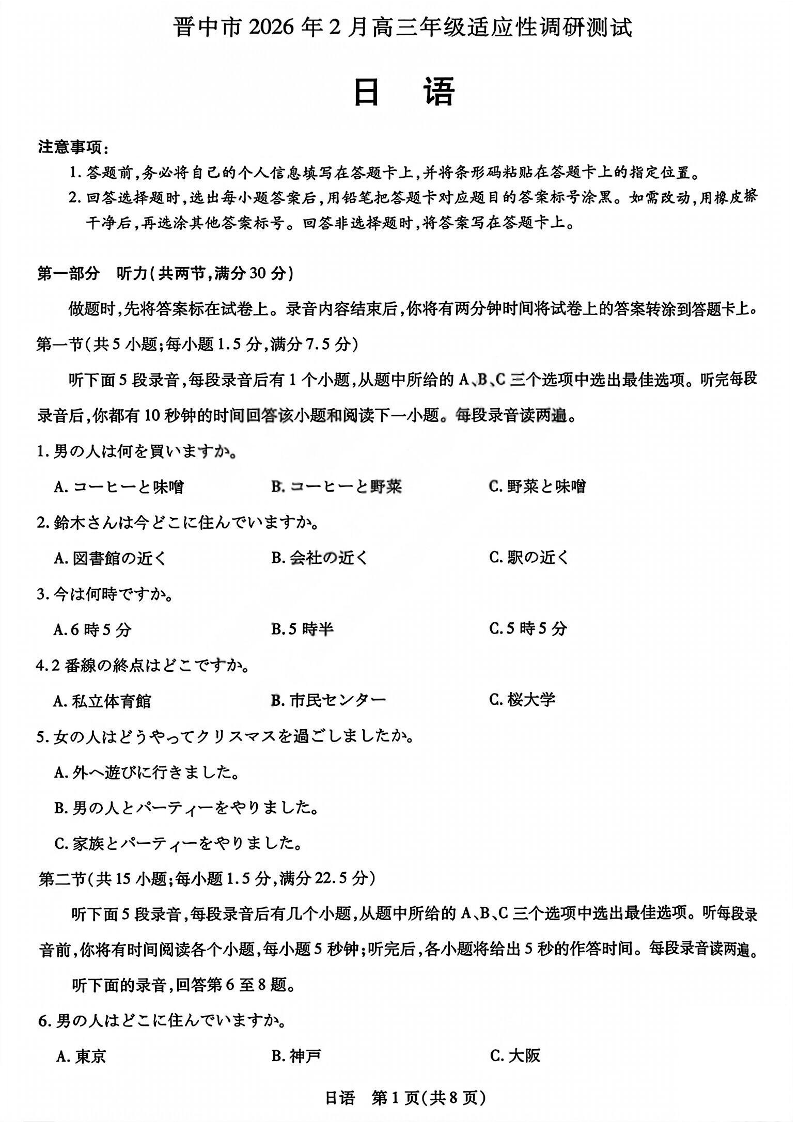 高三日语--山西省晋中市2026届高三年级2月适应性调研考试(晋中一模)