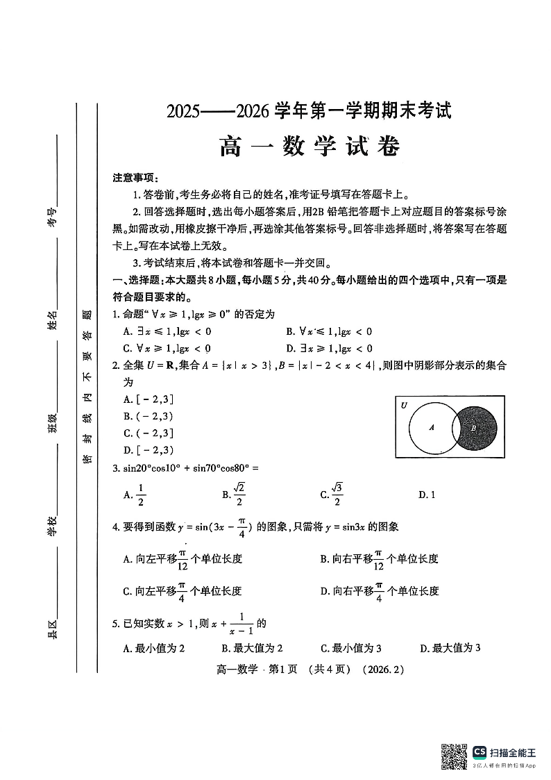 高一数学--河南省洛阳市2025-2026学年高一上学期2月期末考试