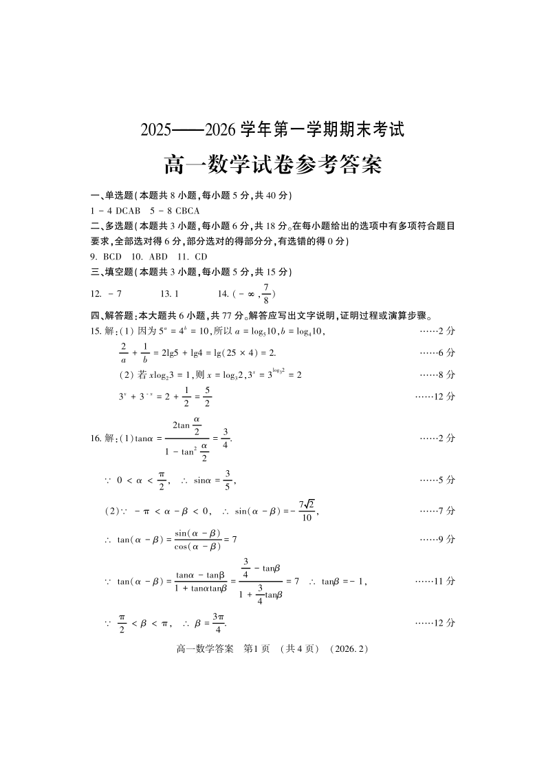 高一数学答案--河南省洛阳市2025-2026学年高一上学期2月期末考试