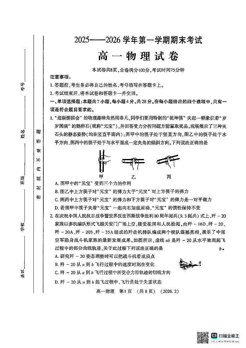 高一物理--河南省洛阳市2025-2026学年高一上学期2月期末考试