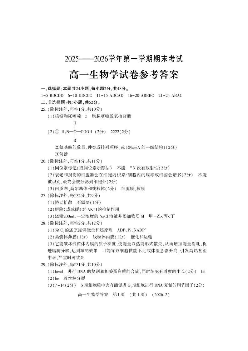 高一生物答案--河南省洛阳市2025-2026学年高一上学期2月期末考试