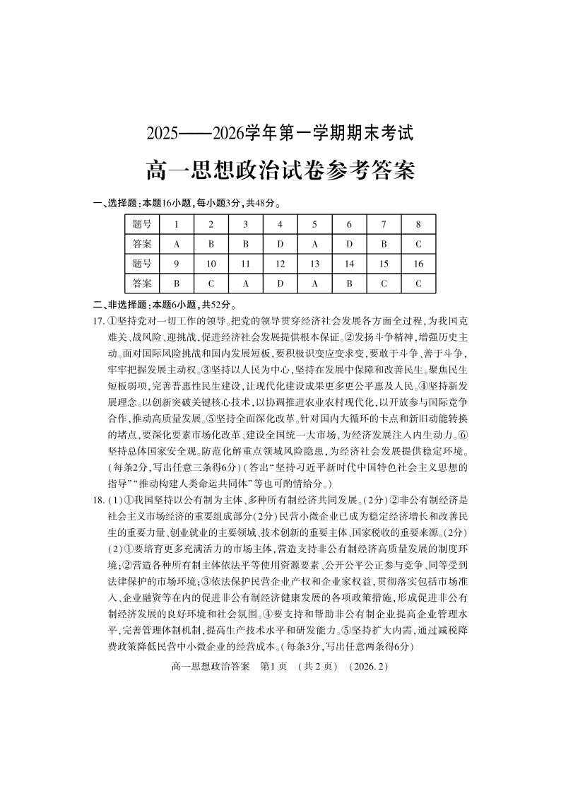 高一政治答案--河南省洛阳市2025-2026学年高一上学期2月期末考试