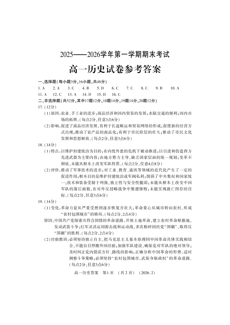 高一历史答案--河南省洛阳市2025-2026学年高一上学期2月期末考试