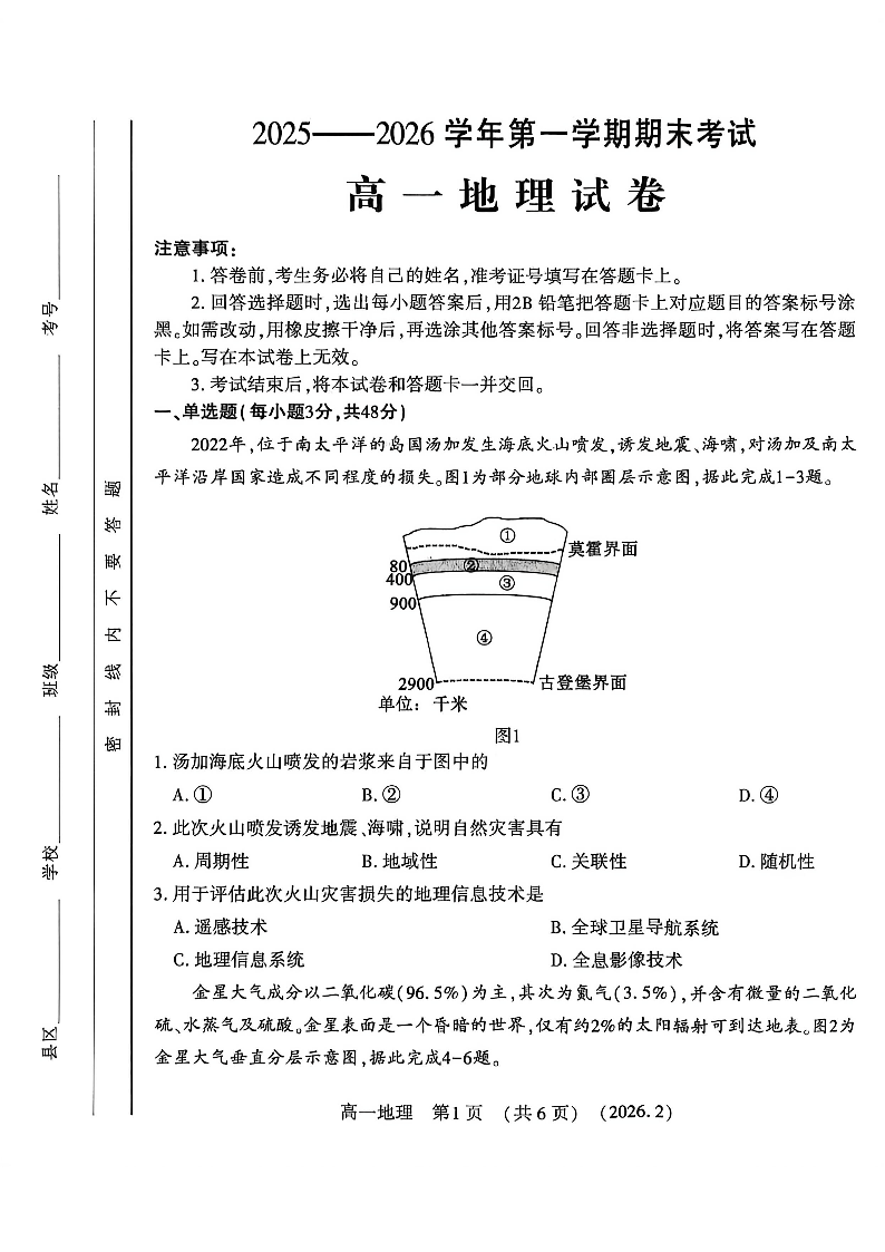 高一地理--河南省洛阳市2025-2026学年高一上学期2月期末考试