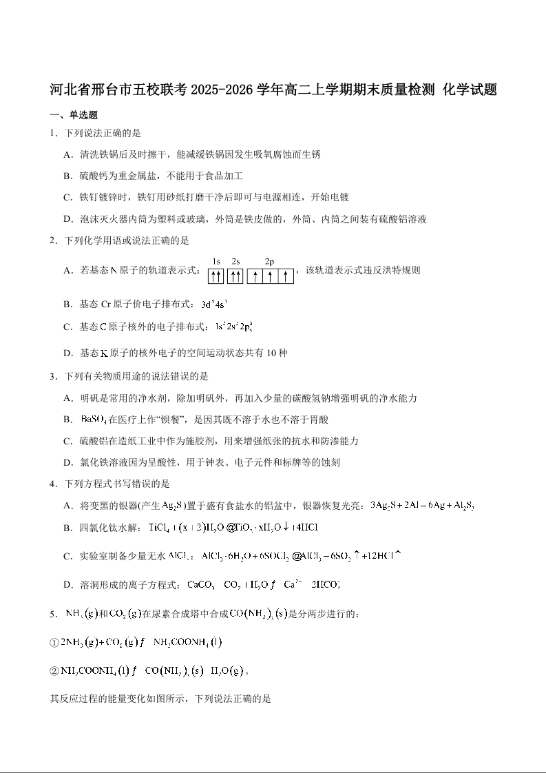 高二化学+答案--河北省邢台市五校联考2025-2026学年高二上学期期末质量检测