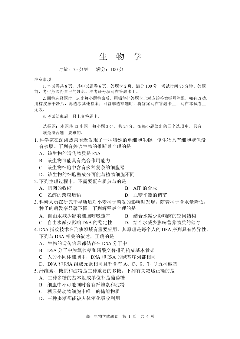高一生物--湖南省常德市沅澧共同体2025-2026学高一上学期期末考试
