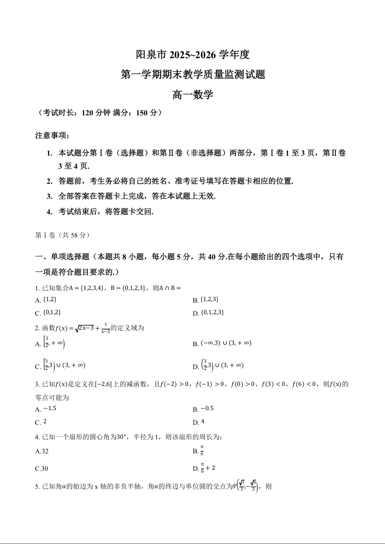 高一数学+答案--山西省阳泉市2025-2026学年上学高一期期末考试