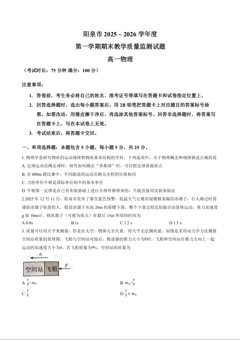 高一物理+答案--山西省阳泉市2025-2026学年上学高一期期末考试
