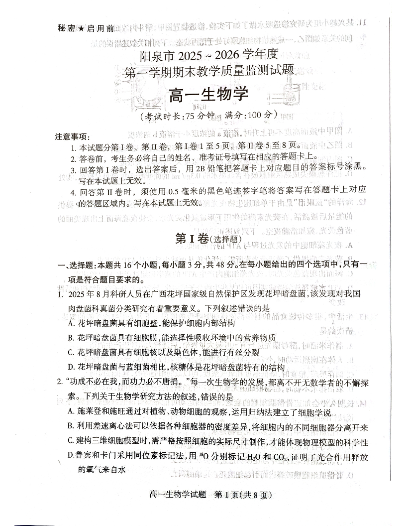 高一生物--山西省阳泉市2025-2026学年上学高一期期末考试