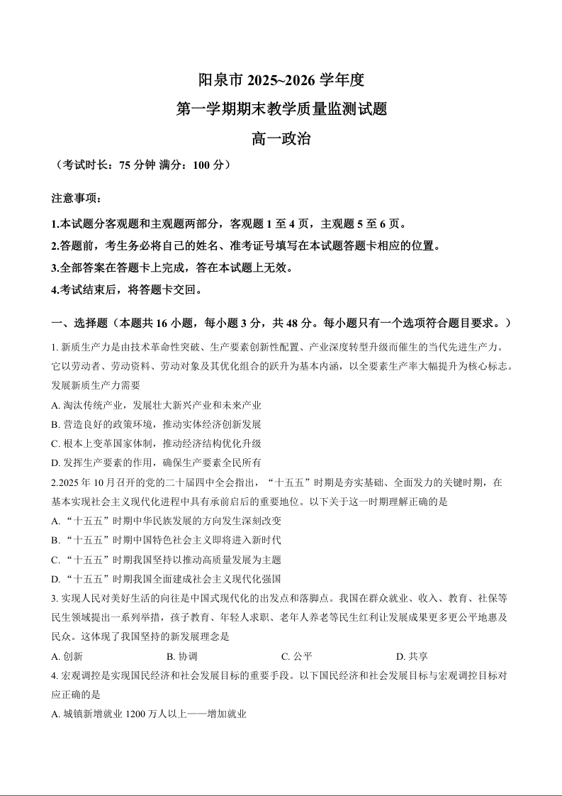高一政治+答案--山西省阳泉市2025-2026学年上学高一期期末考试