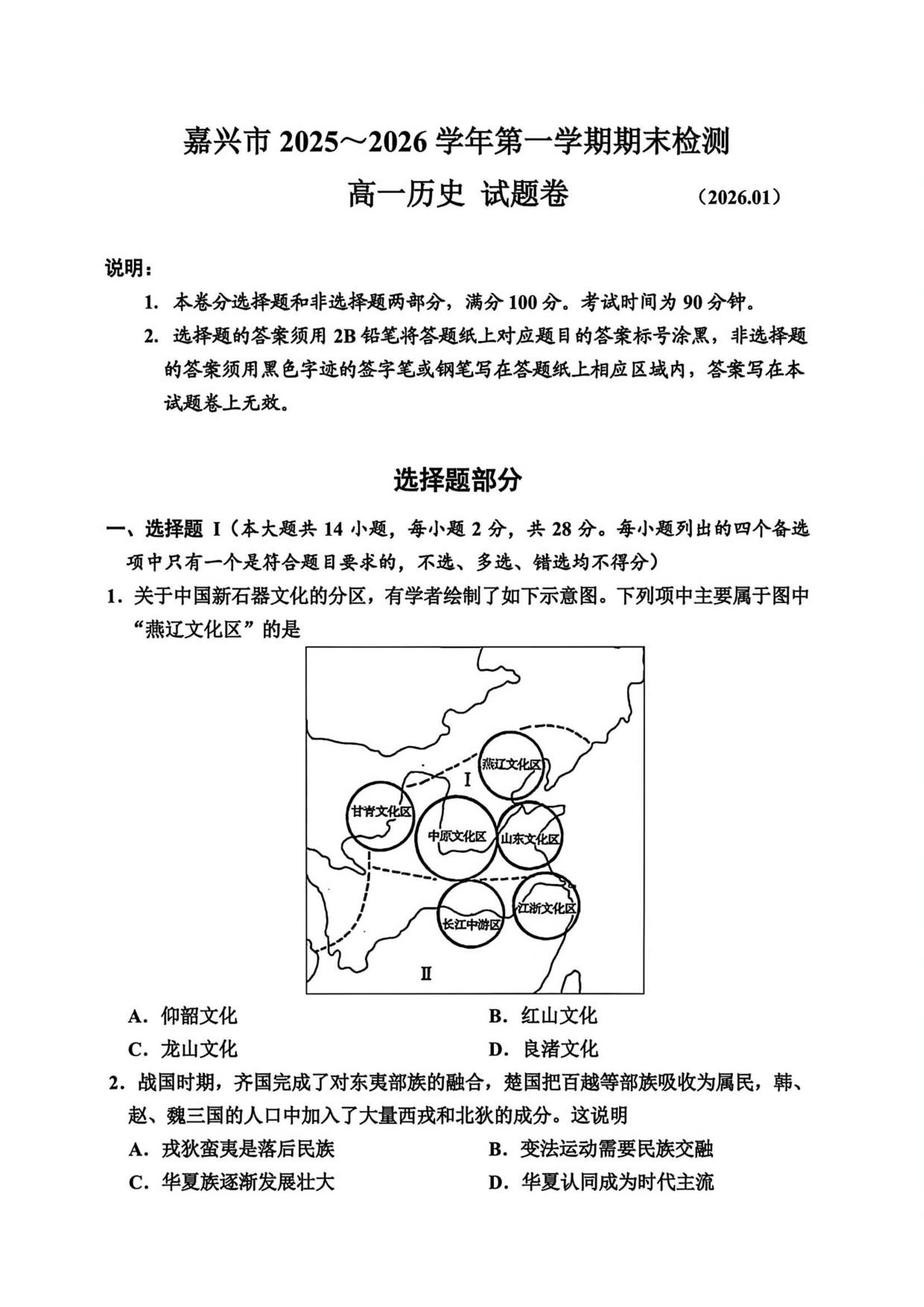 高一历史+答案--浙江省嘉兴市2025-2026学年高一上学期期末考试