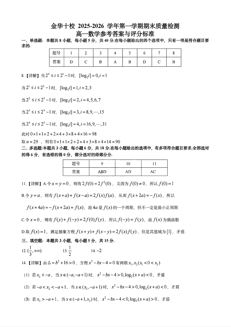 高一数学答案--浙江省金华十校2025-2026学年高一上学期2月期末考试