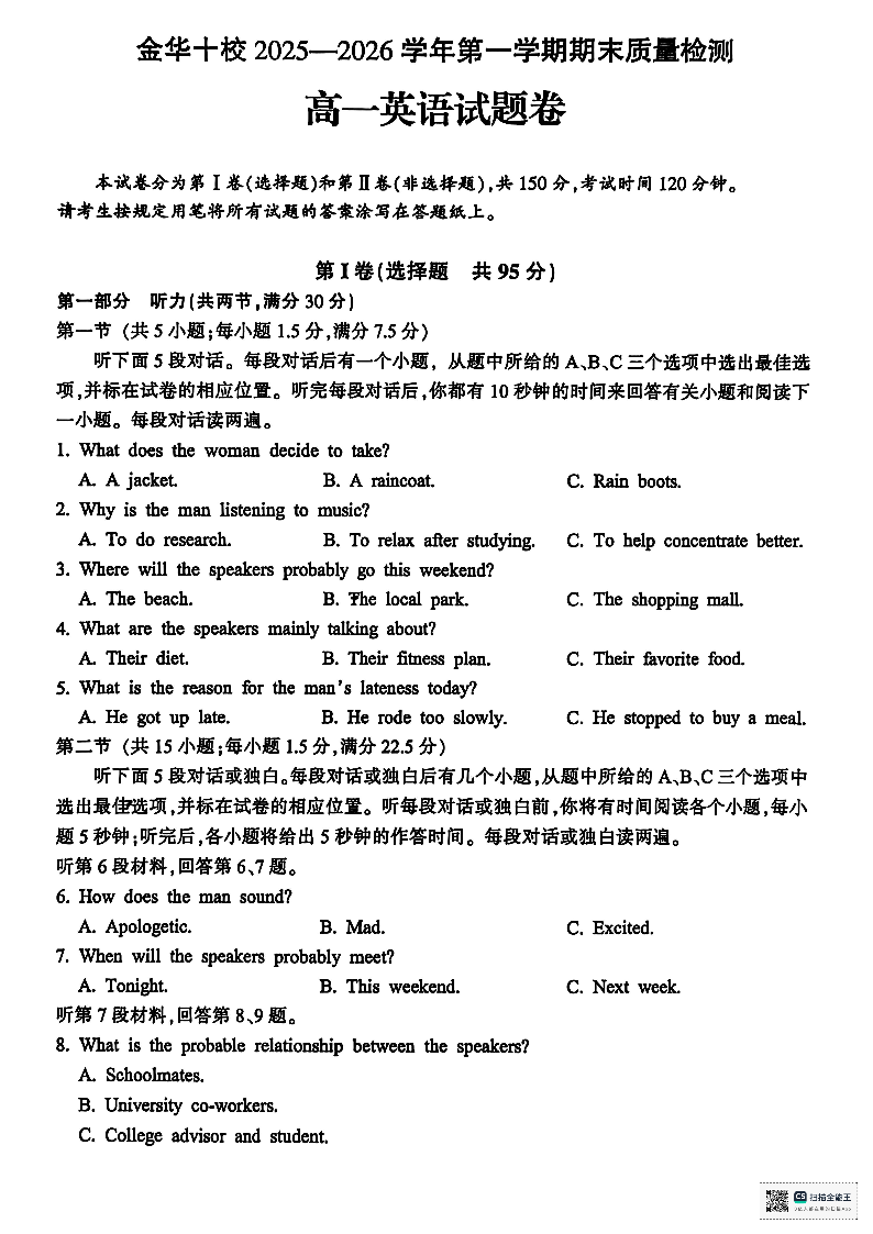 高一英语+答案--浙江省金华十校2025-2026学年高一上学期2月期末考试