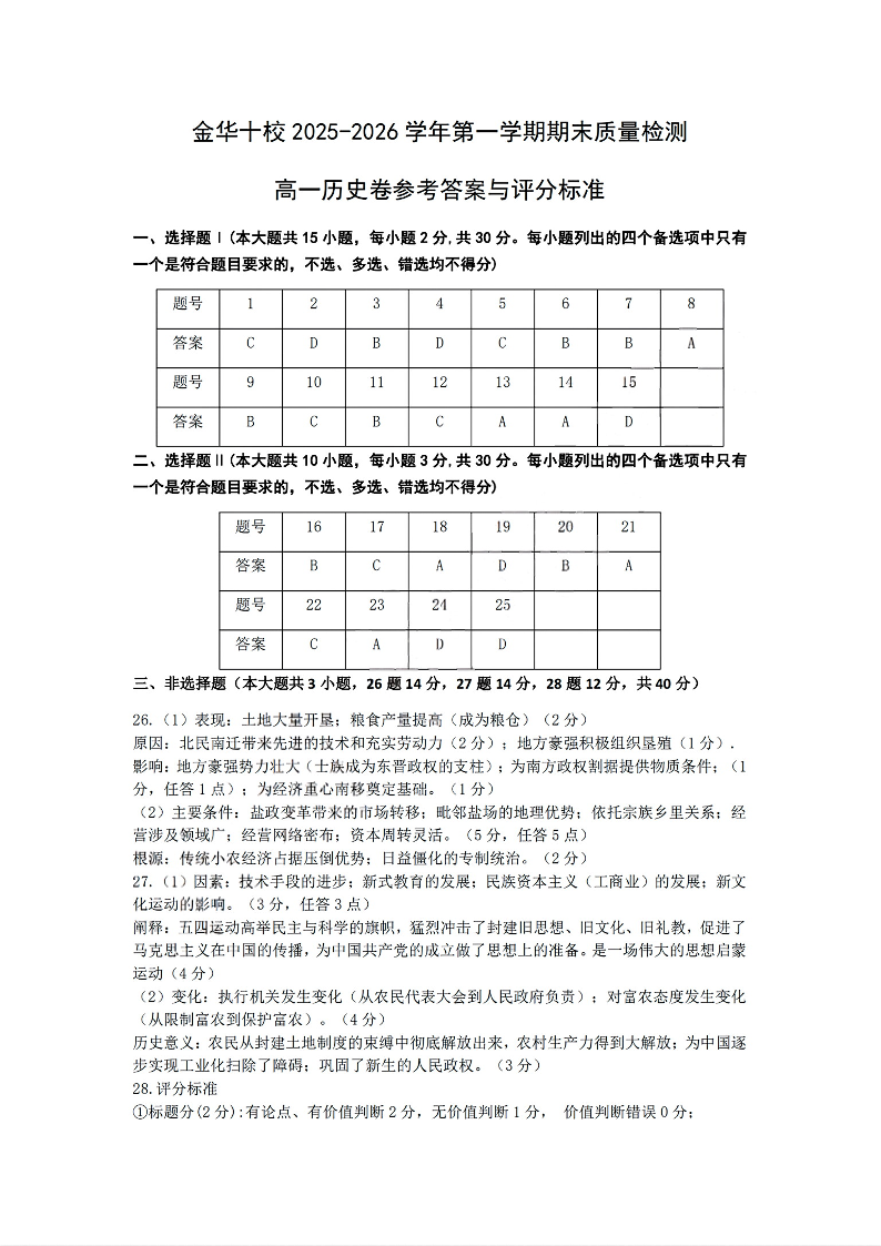 高一历史答案--浙江省金华十校2025-2026学年高一上学期2月期末考试