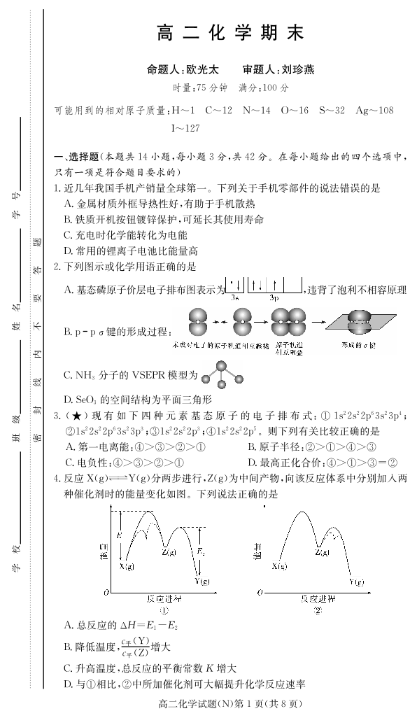 高二化学--湖南省长沙市长郡中学2025-2026学年高二上学期1月期末考试