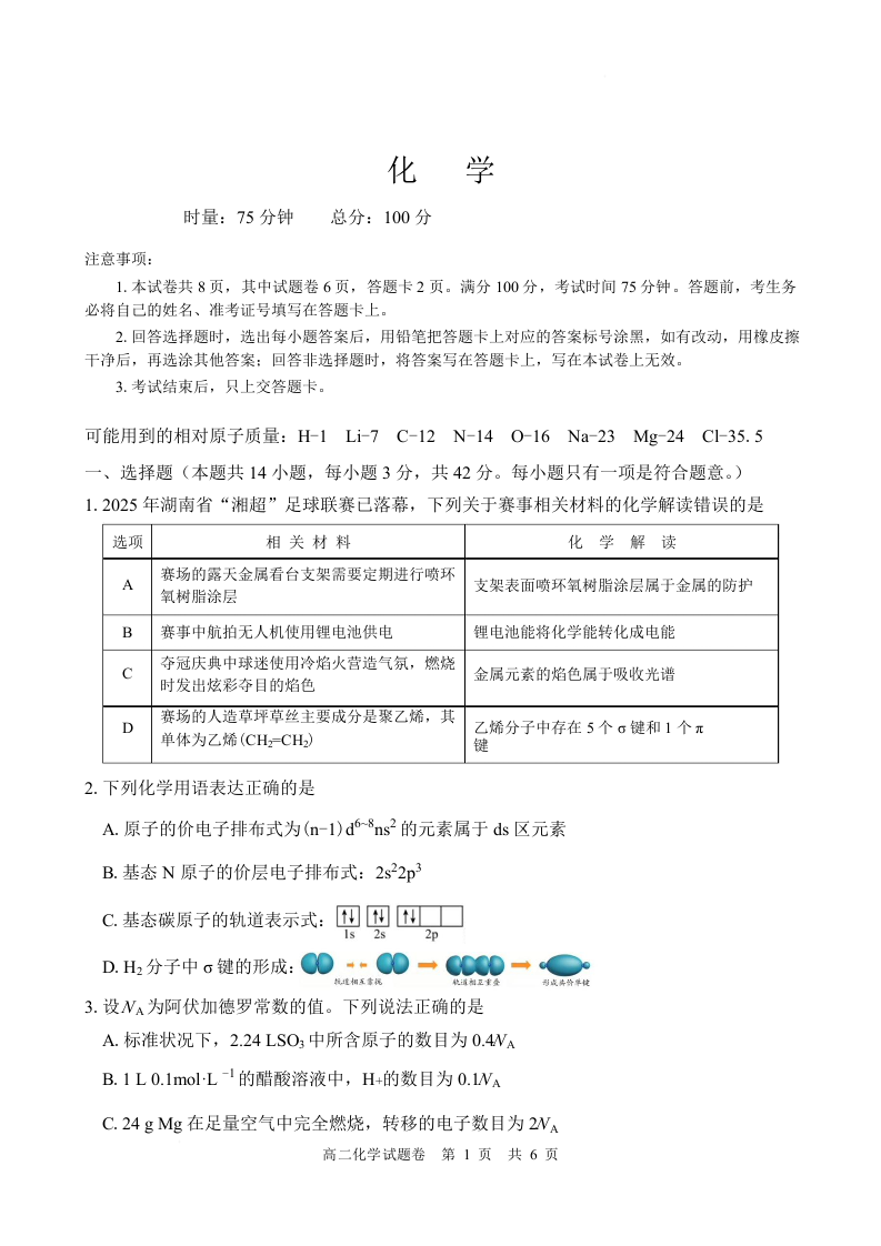 高二化学--湖南省常德市沅澧共同体2025-2026学高二上学期期末考试