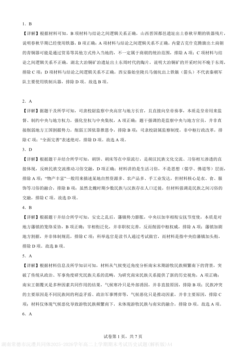 高二历史(解析版)--湖南省常德市沅澧共同体2025-2026学高二上学期期末考试