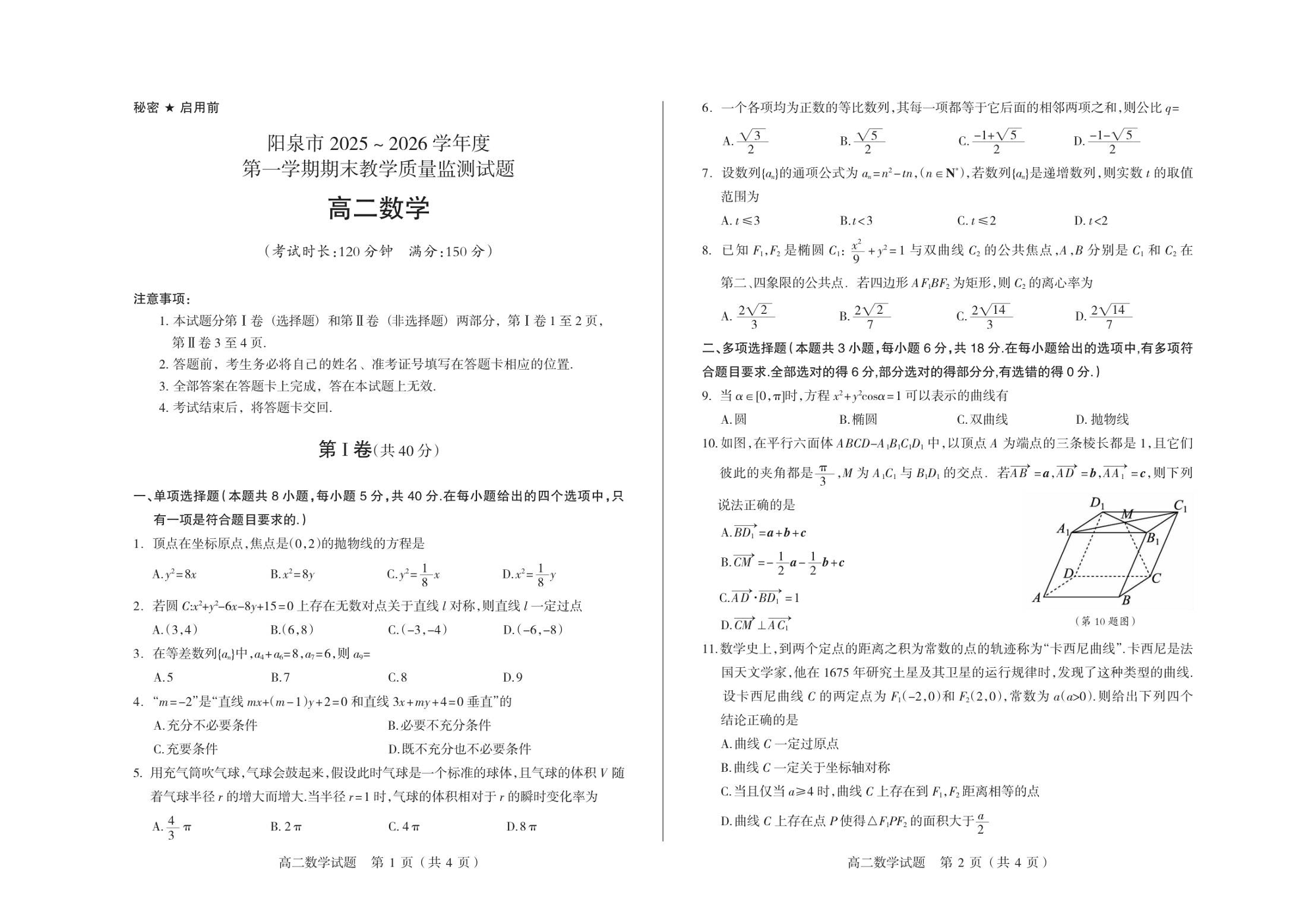 高二数学--山西省阳泉市2025-2026学年高二上学期期末考试