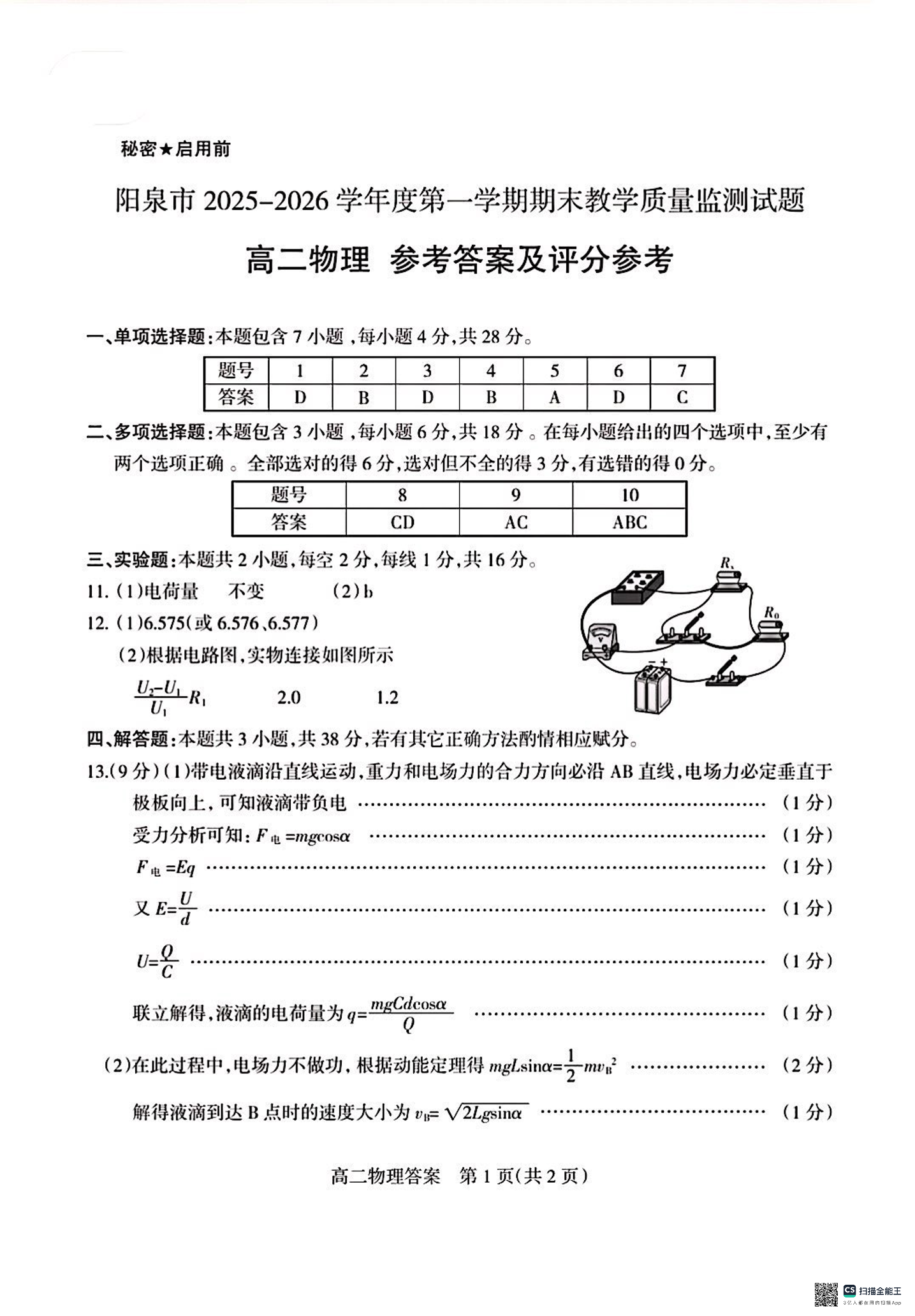 高二物理答案--山西省阳泉市2025-2026学年高二上学期期末考试