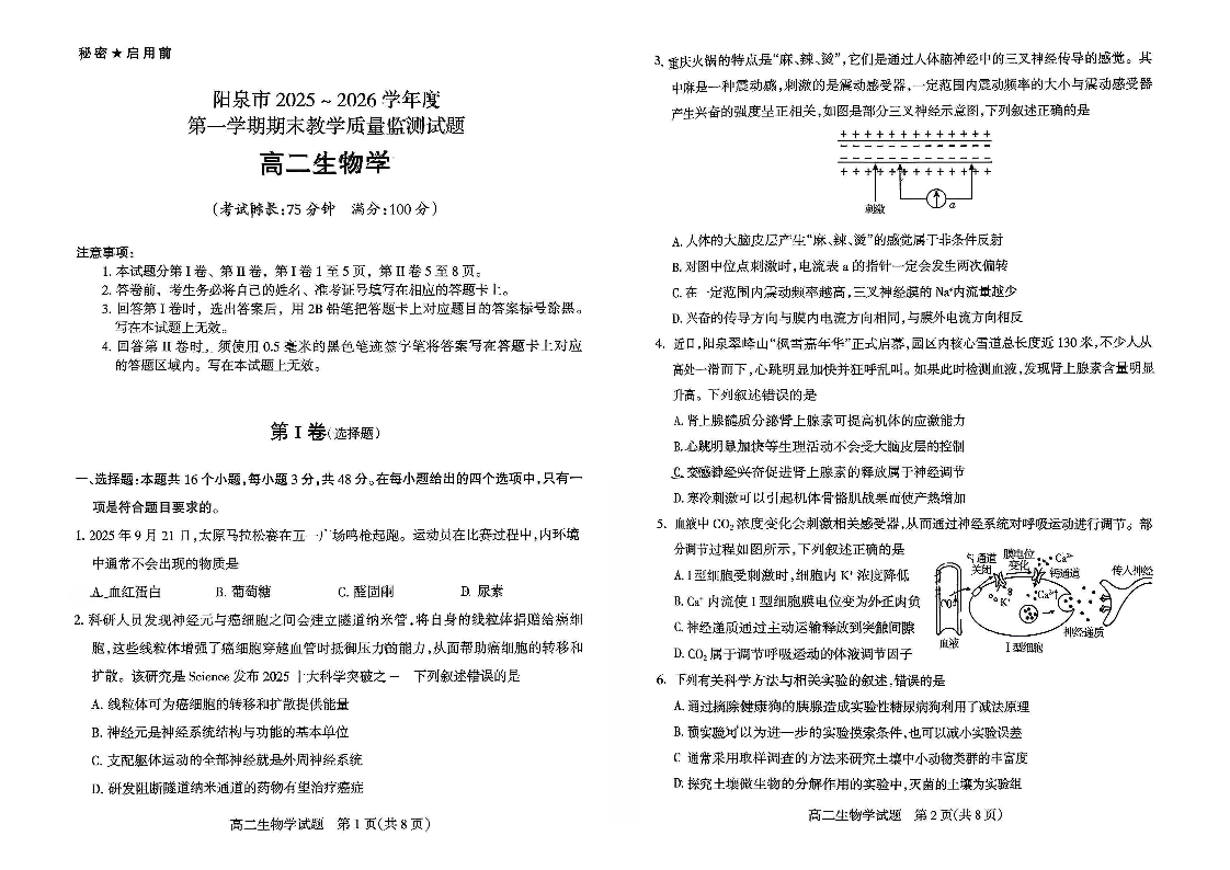 高二生物--山西省阳泉市2025-2026学年高二上学期期末考试
