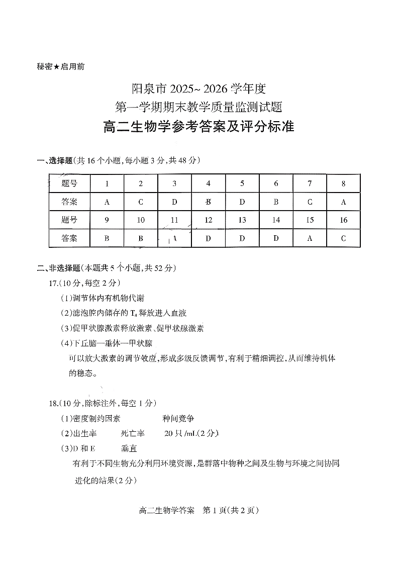 高二生物答案--山西省阳泉市2025-2026学年高二上学期期末考试