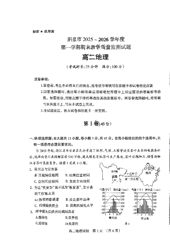 高二地理--山西省阳泉市2025-2026学年高二上学期期末考试