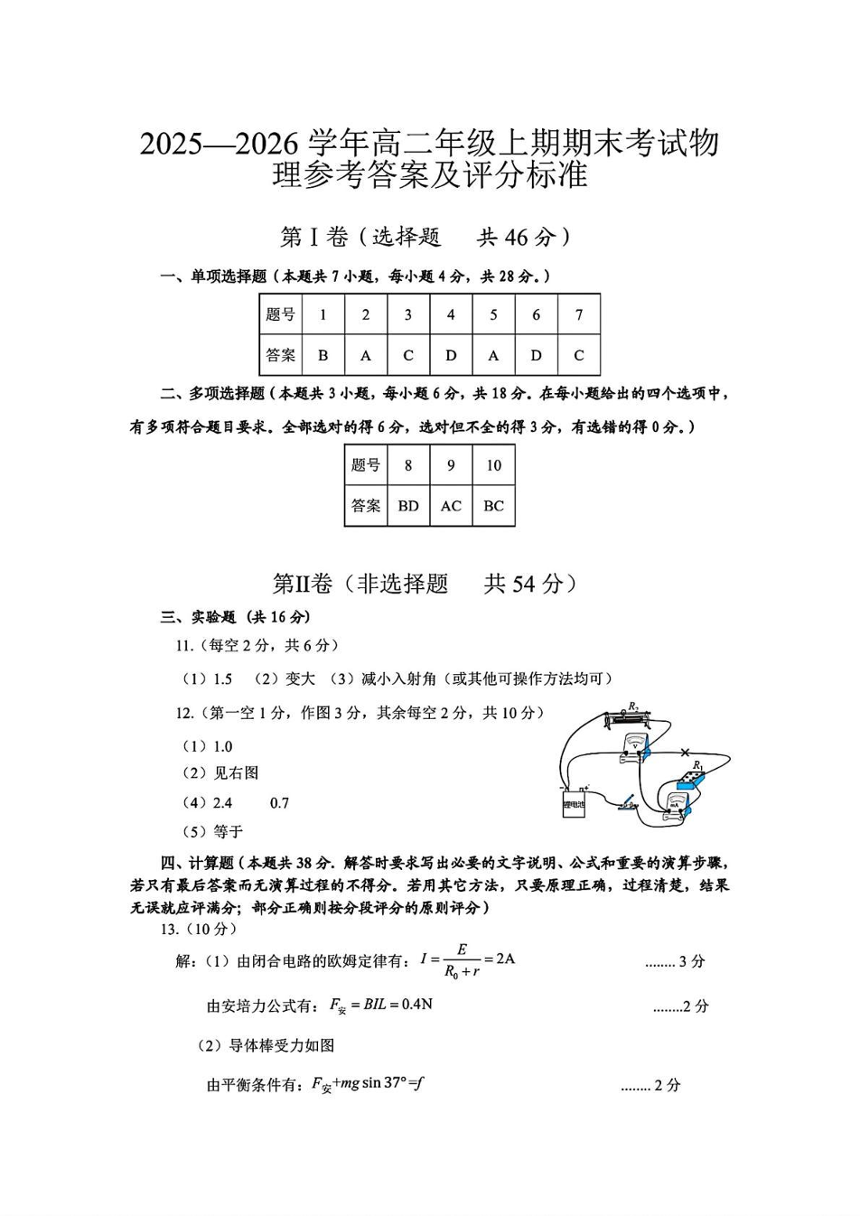 高二物理答案--四川省自贡市2025-2026学年高二上学期1月期末考试