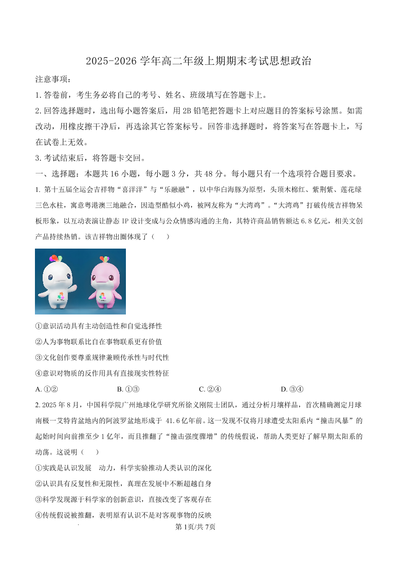 高二政治--四川省自贡市2025-2026学年高二上学期1月期末考试