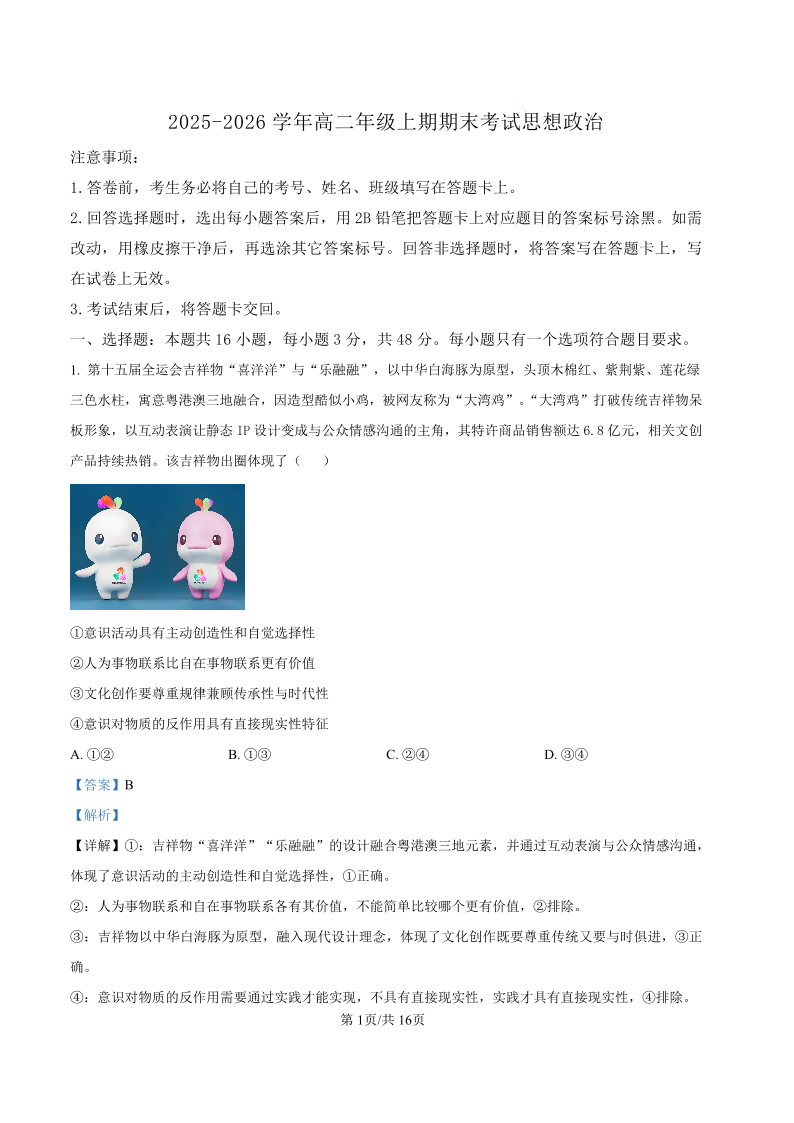 高二政治答案--四川省自贡市2025-2026学年高二上学期1月期末考试