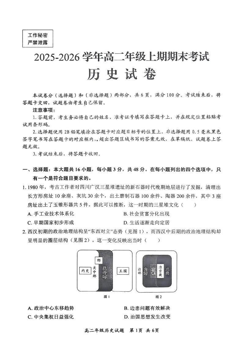 高二历史--四川省自贡市2025-2026学年高二上学期1月期末考试