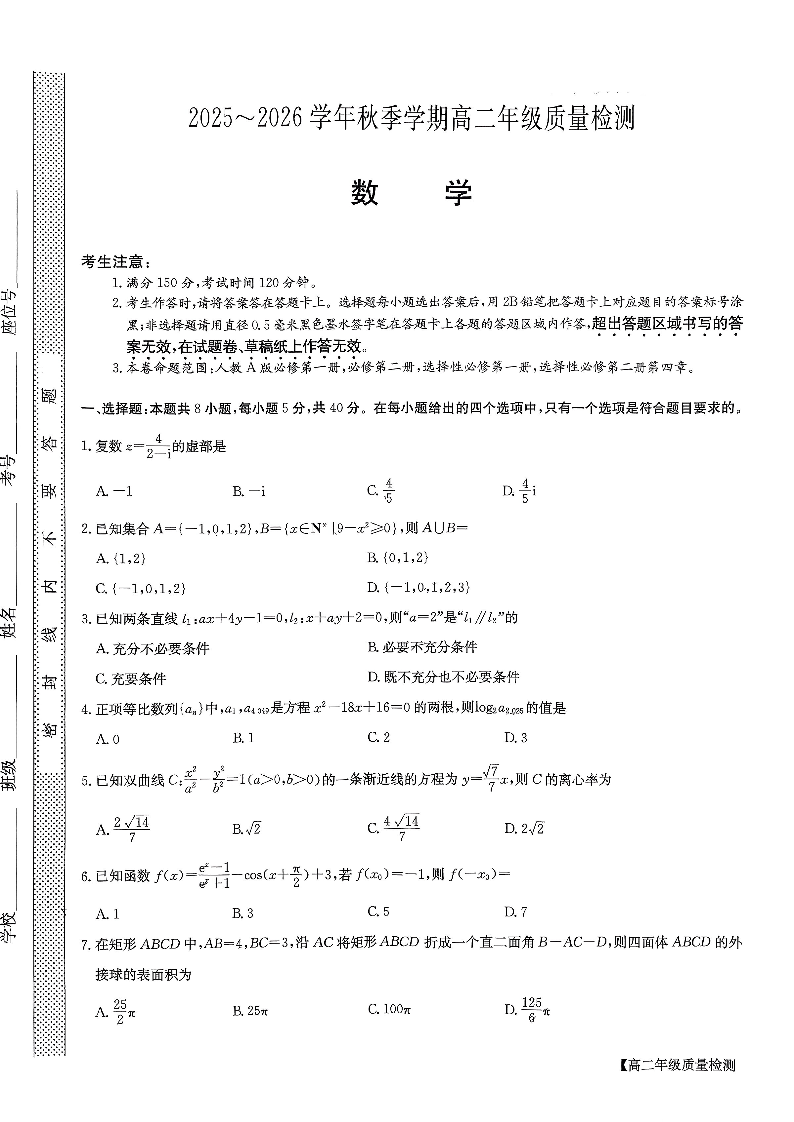 高二数学--云南省昭通市多县2025-2026学年高二上学期期末
