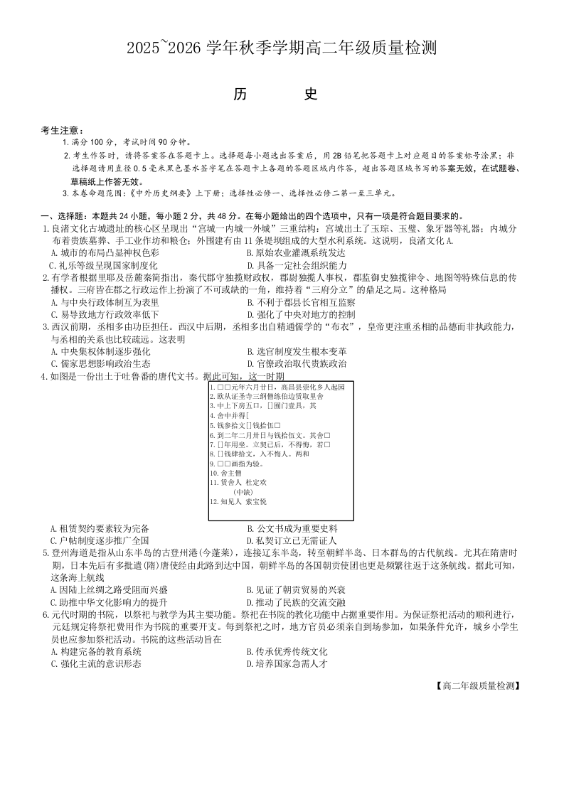 高二历史--云南省昭通市多县2025-2026学年高二上学期期末