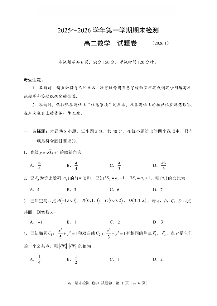 高二数学--浙江省嘉兴市2025-2026学年高二上学期期末考试