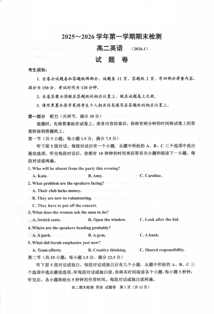 高二英语--浙江省嘉兴市2025-2026学年高二上学期期末考试