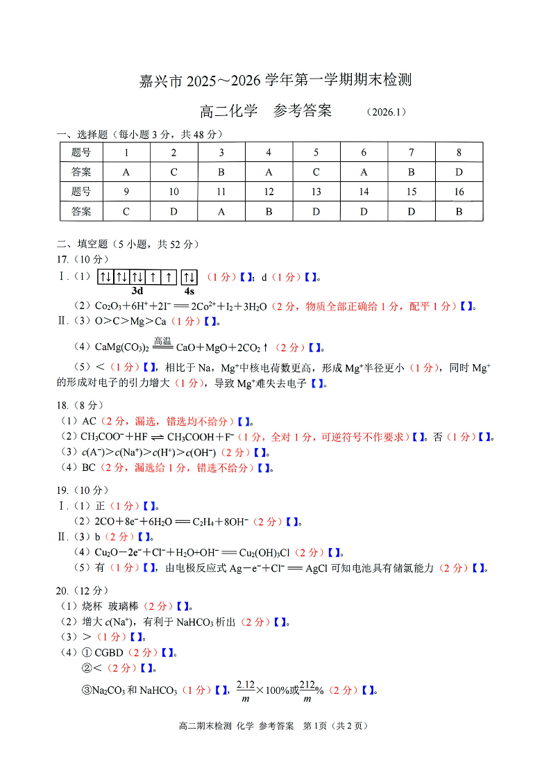 高二化学答案--浙江省嘉兴市2025-2026学年高二上学期期末考试