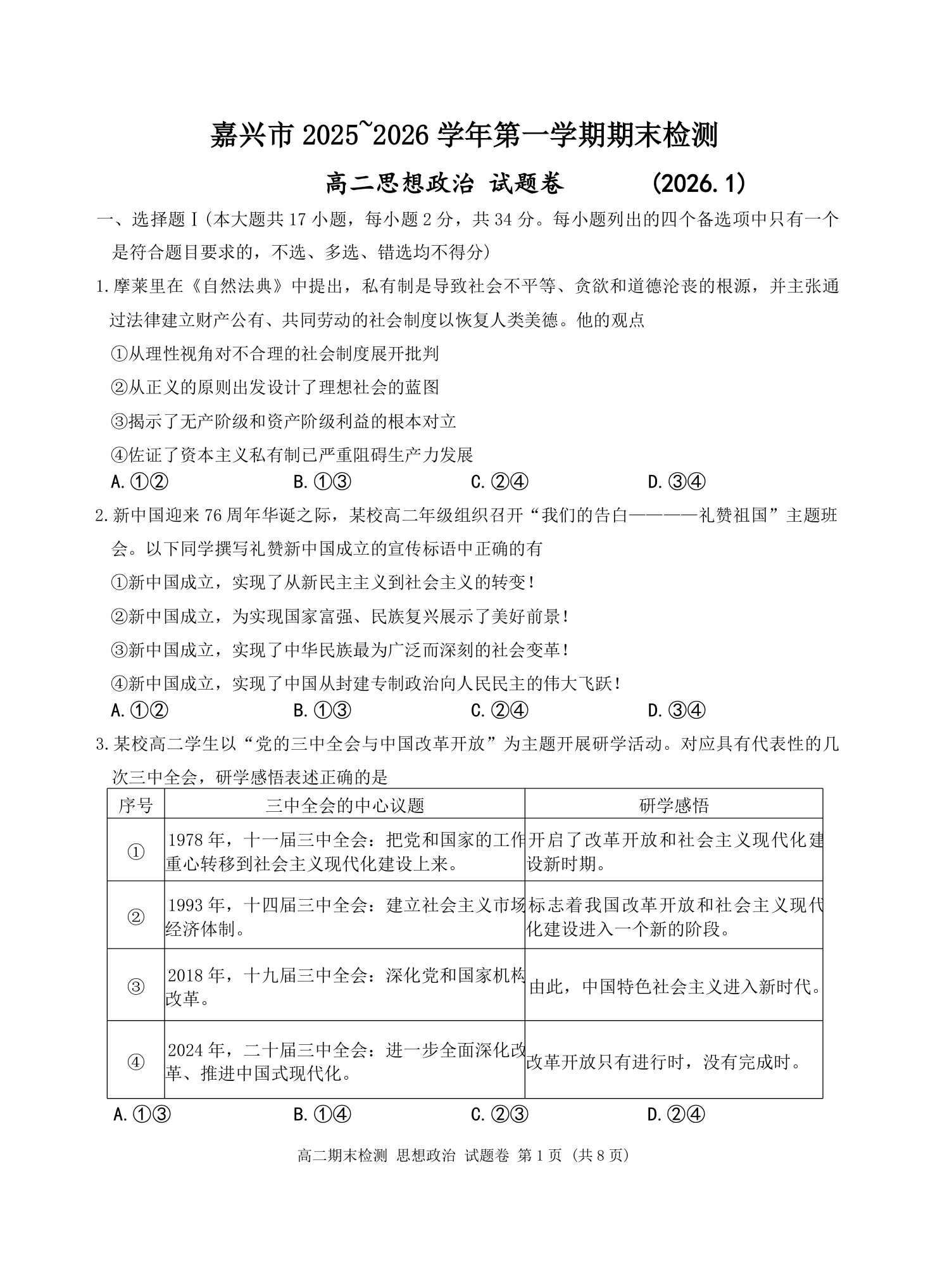 高二政治--浙江省嘉兴市2025-2026学年高二上学期期末考试