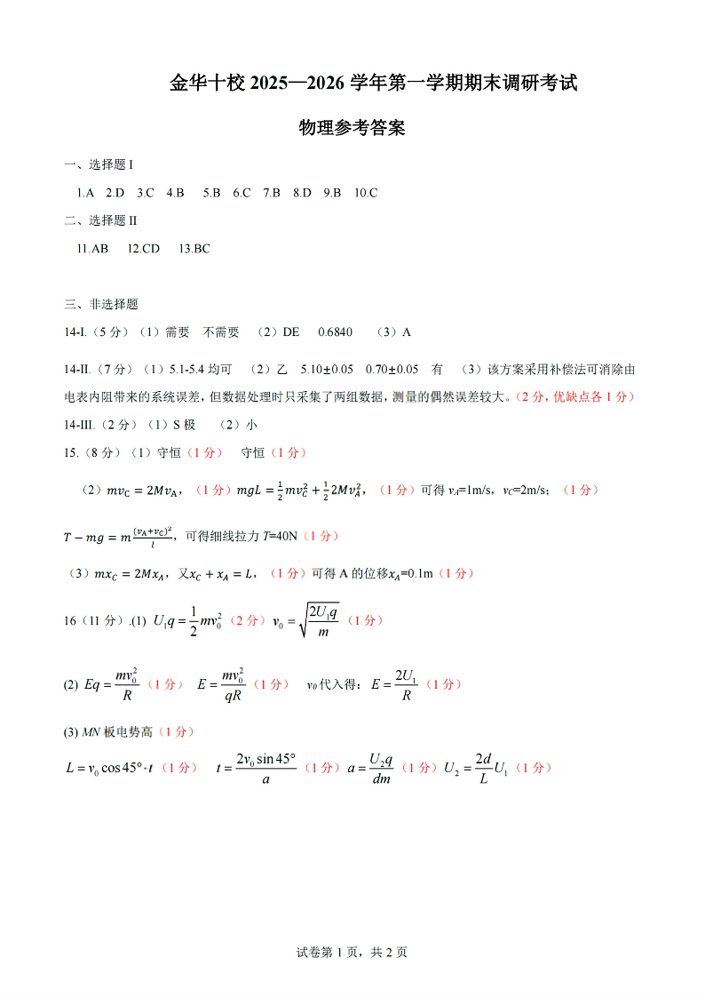 高二物理答案--浙江省金华十校2025-2026学年高二上学期2月期末考试
