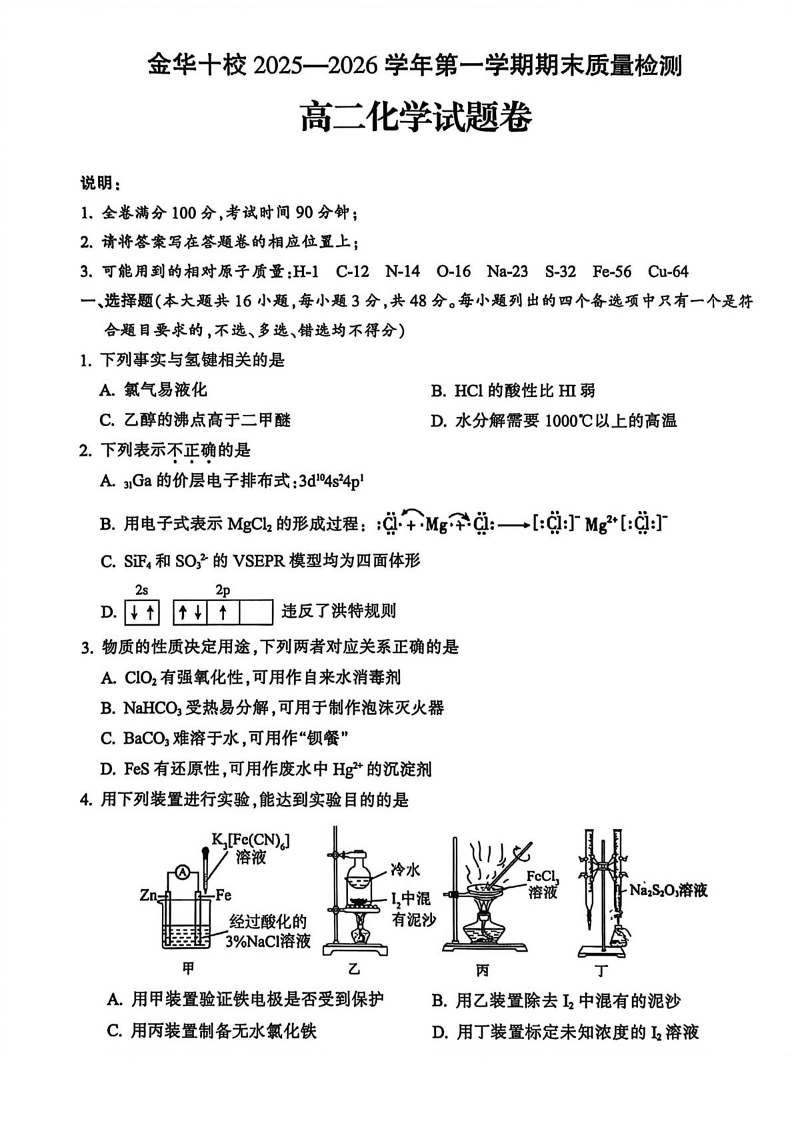 高二化学+答案--浙江省金华十校2025-2026学年高二上学期2月期末考试