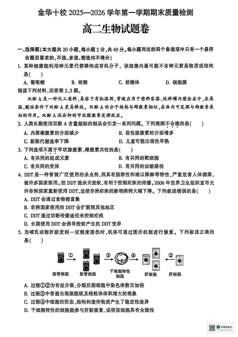 高二生物+答案--浙江省金华十校2025-2026学年高二上学期2月期末考试