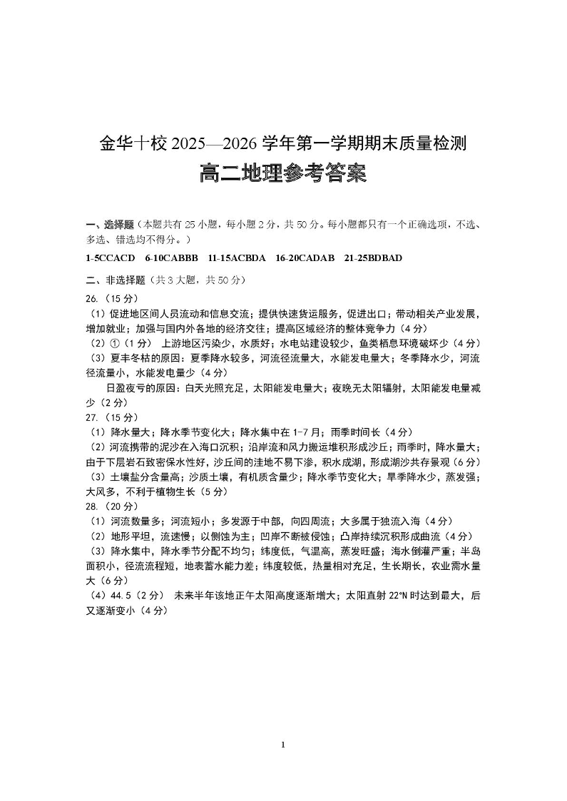 高二地理答案--浙江省金华十校2025-2026学年高二上学期2月期末考试