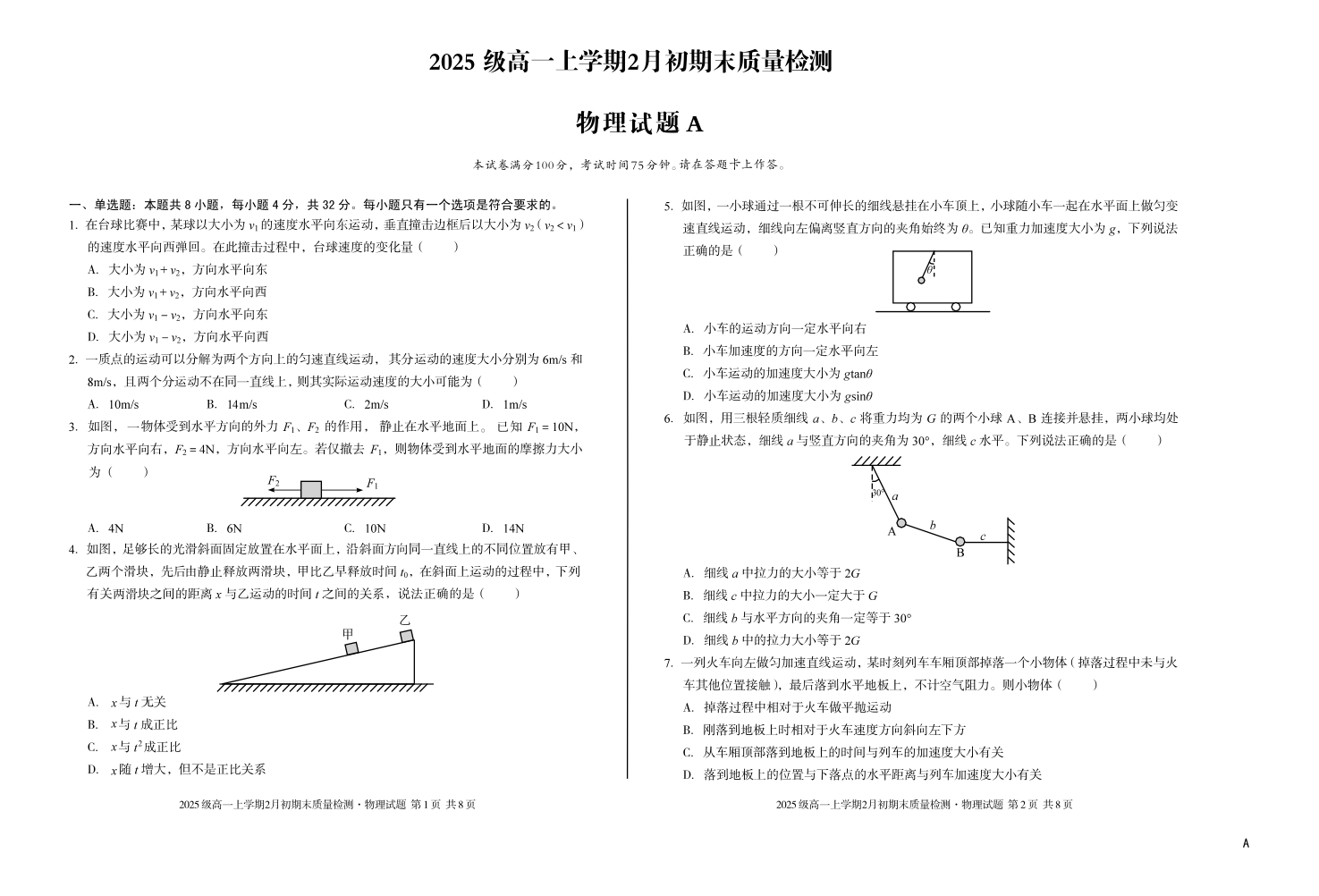 高一物理A--安徽省A10联盟2025-2026学年高一上学期2月初期末质量检测