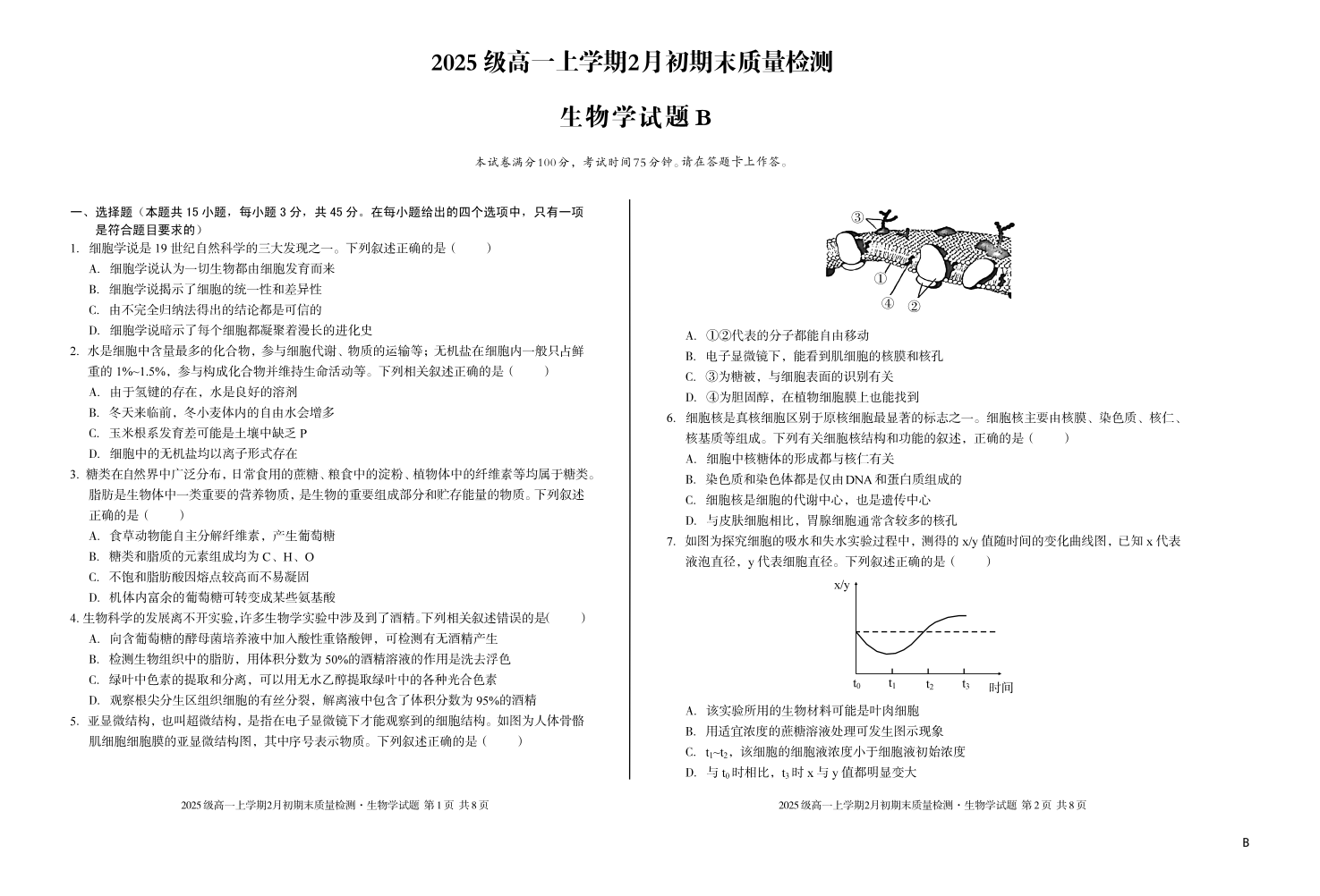 高一生物B--安徽省A10联盟2025-2026学年高一上学期2月初期末质量检测