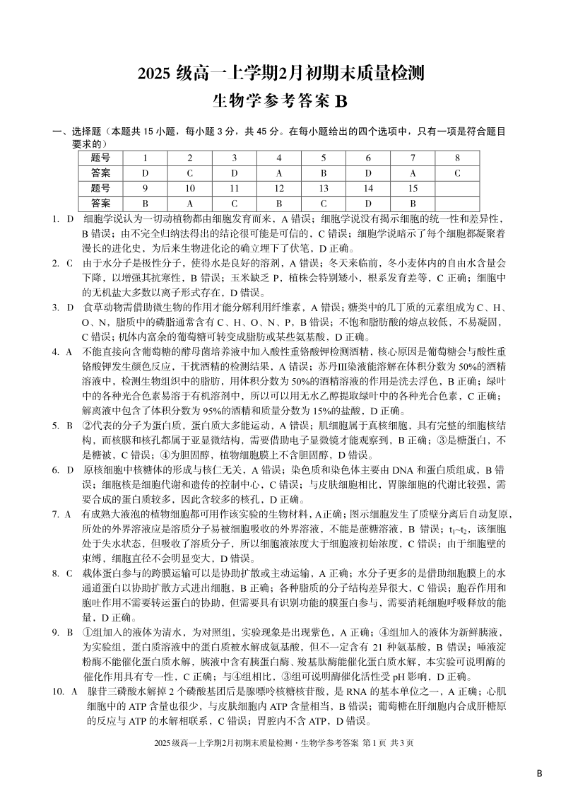 高一生物B答案--安徽省A10联盟2025-2026学年高一上学期2月初期末质量检测