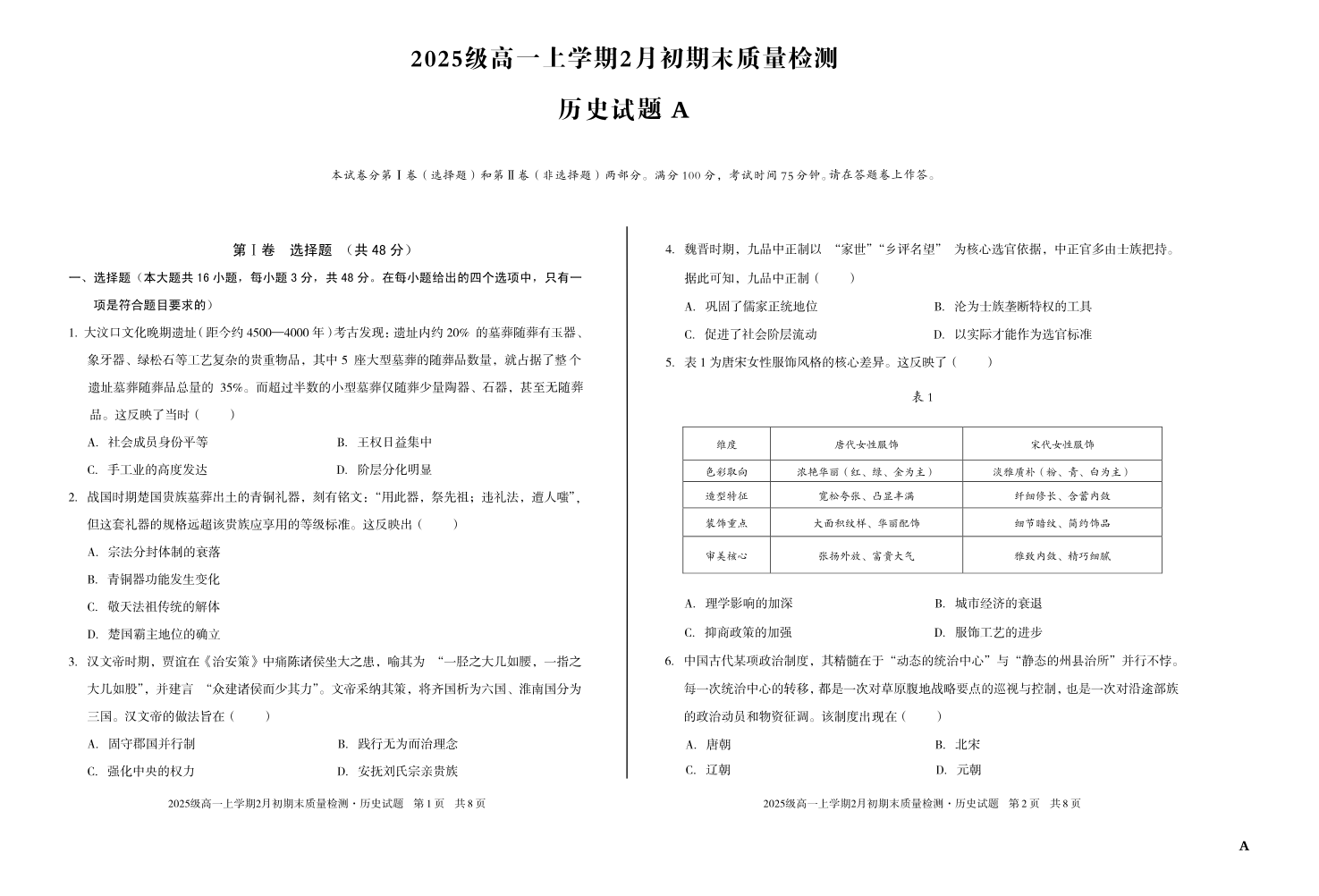 高一历史A--安徽省A10联盟2025-2026学年高一上学期2月初期末质量检测