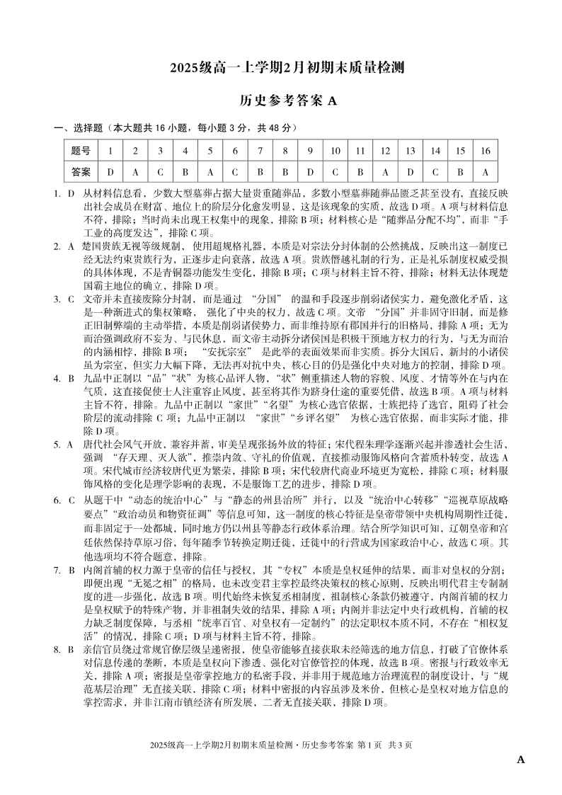 高一历史A答案--安徽省A10联盟2025-2026学年高一上学期2月初期末质量检测