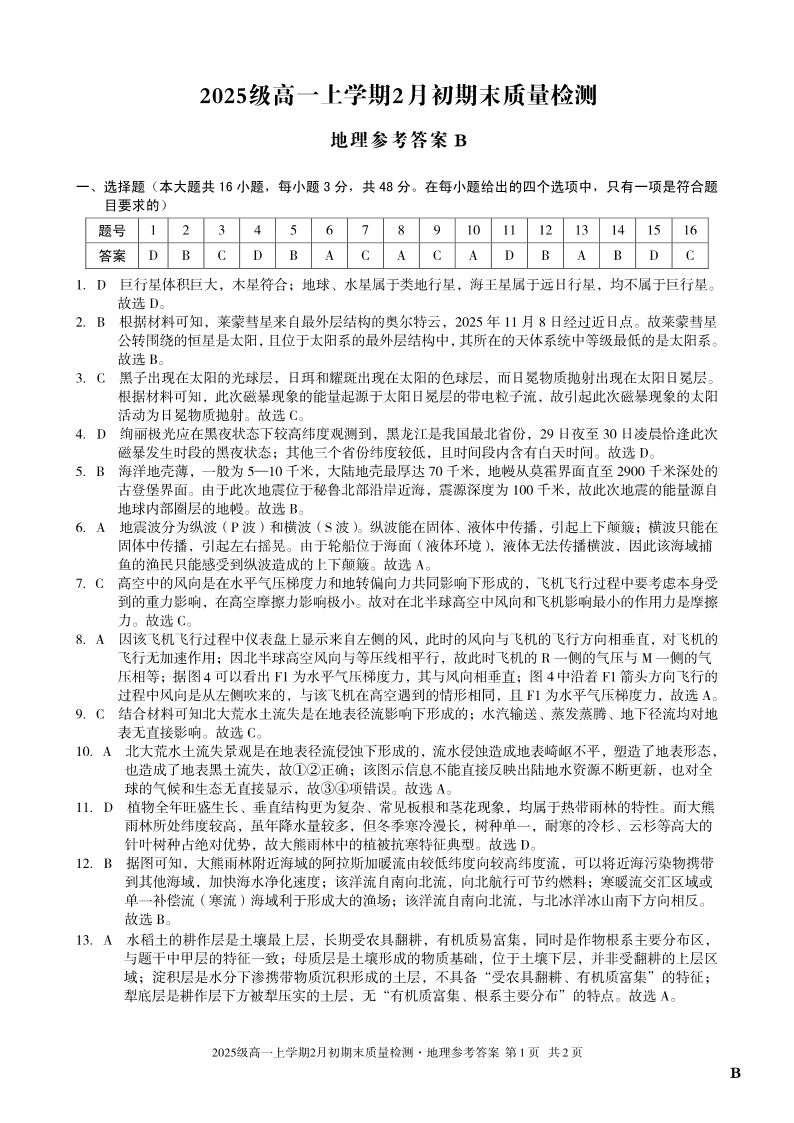 高一地理B答案--安徽省A10联盟2025-2026学年高一上学期2月初期末质量检测