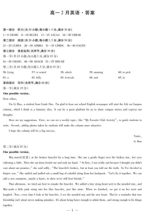 高一英语答案--安徽省合肥六中等学校2025-2026学年高一上学期2月期末考试