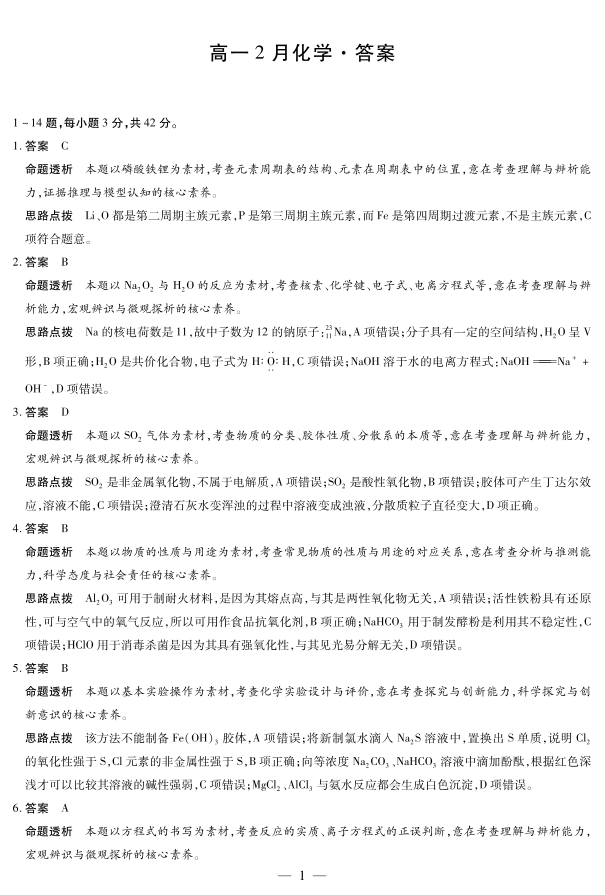 高一化学答案--安徽省合肥六中等学校2025-2026学年高一上学期2月期末考试