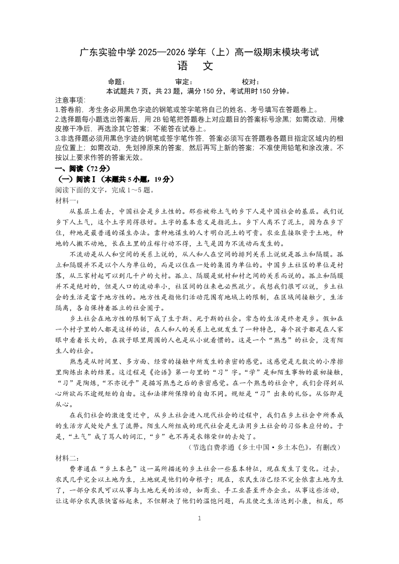 高一语文--广东实验中学2025-2026学年高一上学期期末考试
