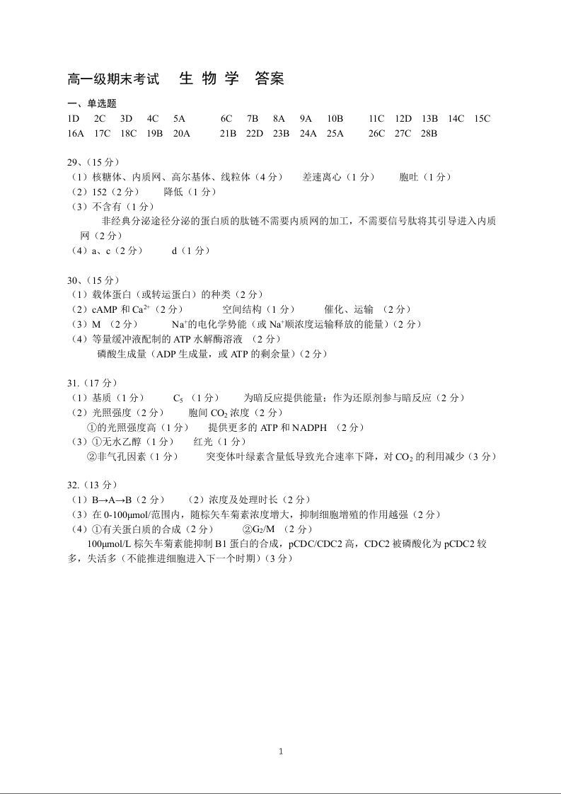 高一生物答案--广东实验中学2025-2026学年高一上学期期末考试